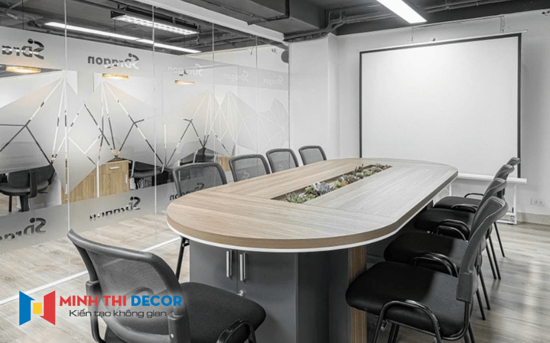 Phòng họp luôn cần được tách biệt với các khu vực bên ngoài với việc sử dụng các vách ngăn kính dán decal mờ. Như vậy sẽ vừa đảm bảo được tính liên kết trong không gian, vừa mang đến không gian riêng tư cần thiết cho phòng họp.