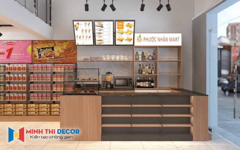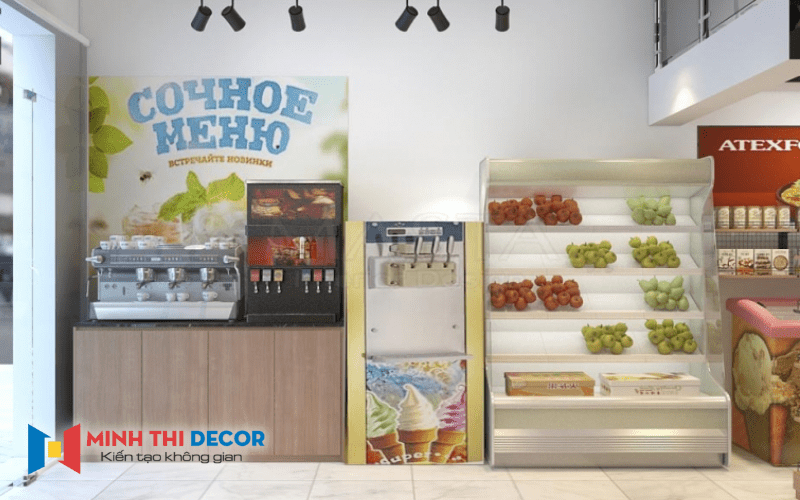 Đội ngũ tại Minh Thi Decor đã lấy ý tưởng chủ yếu từ các cửa hàng đồ ăn nhanh phổ biến để tạo nên thiết kế cho chị Hà. Khi đặt chân vào cửa hàng, sản phẩm sẽ là thứ đập vào mắt họ đầu tiên.