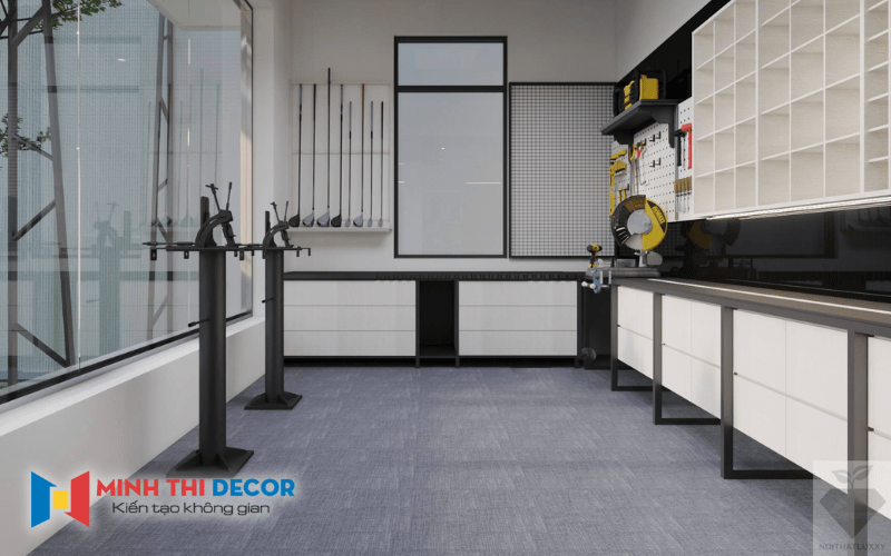 Toàn bộ không gian cửa hàng được phủ lớp sơn màu trắng. Điều này khiến cho công trình trở nên sang trọng, rộng rãi và hiện đại hơn. Đồng thời, trên các kệ đều được lắp đặt hệ thống đèn chiếu sáng hiệu quả. Kệ tủ cũng được chia thành các ngăn hình hộp, giúp cho việc bày trí tiện lợi hơn.