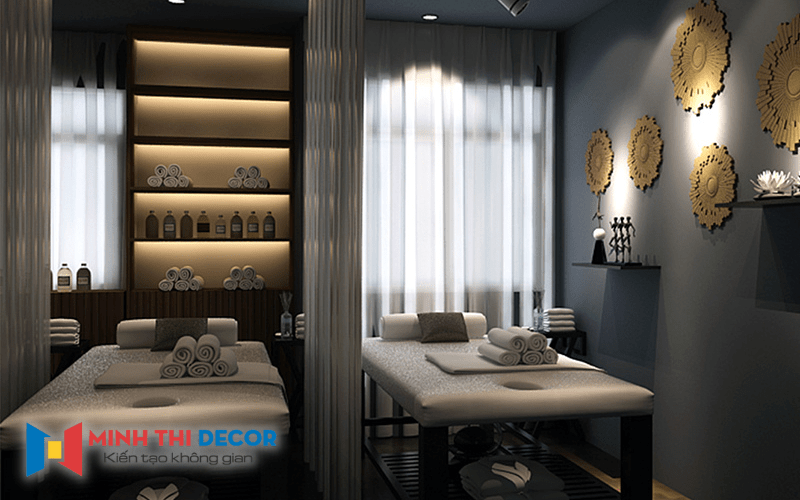 Bên cạnh đó, khu vực massage body – massage toàn thân lại được chia thành các không gian nhỏ hơn, ngăn cách với nhau chỉ bằng những tấm rèm vải đơn giản nhưng nhẹ nhàng, hợp thẩm mỹ nhưng vẫn đủ riêng tư. Đồng thời, nhà vệ sinh hay các phòng thay đồ cho khách cũng được thiết kế đơn giản, tinh tế và hài hòa với không gian chung.