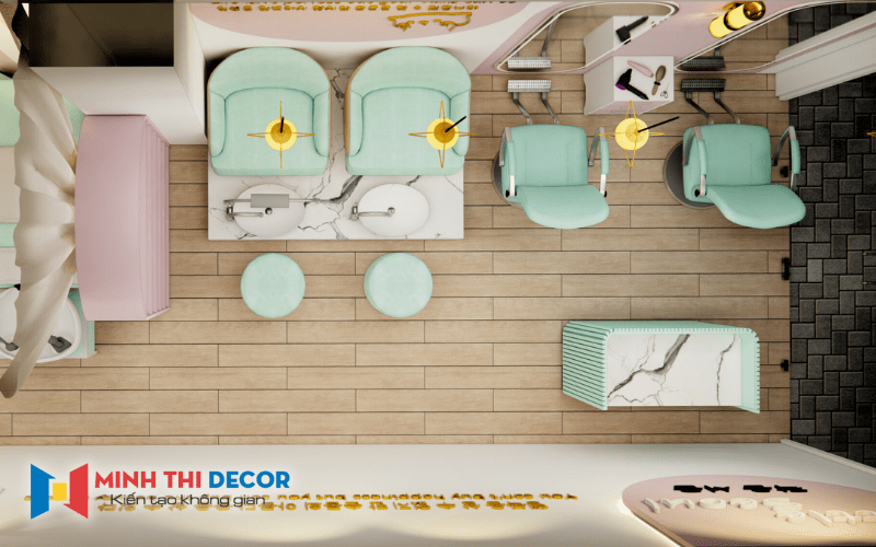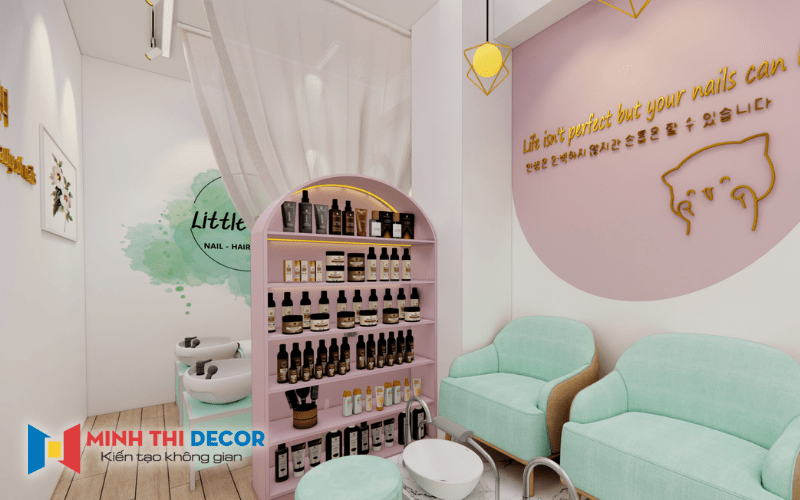 Có những chi tiết trang trí khá nổi bật được sử dụng mà bạn sẽ dễ dàng nhận ra được như chiếc ghế sofa xanh bạc hà, tủ đồ, vách tường với tông màu hồng nhẹ nhàng. Các chi tiết, trang thiết bị nội thất sử dụng trong không gian đã mang đến sự nổi bật quan trọng cũng như góp phần làm cho không gian tiệm nail dù nhỏ bé nhưng vẫn đủ sức thu hút khách hàng. Còn chần chờ chi mà không liên hệ ngay với Minh Thi Decor để có thể sở hữu không gian tiệm nail thẩm mỹ cao tương tự bạn nhé!