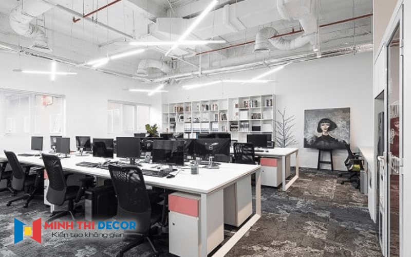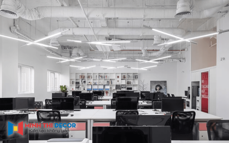 Với diện tích ở mức tương đối, Minh Thi Decor đã lựa chọn phương thức thiết kế văn phòng với cách bố trí nhiều bàn dài nhằm tối ưu diện tích sử dụng. Đây cũng là cách để đem đến không gian làm việc rộng rãi hơn cho nhân viên.